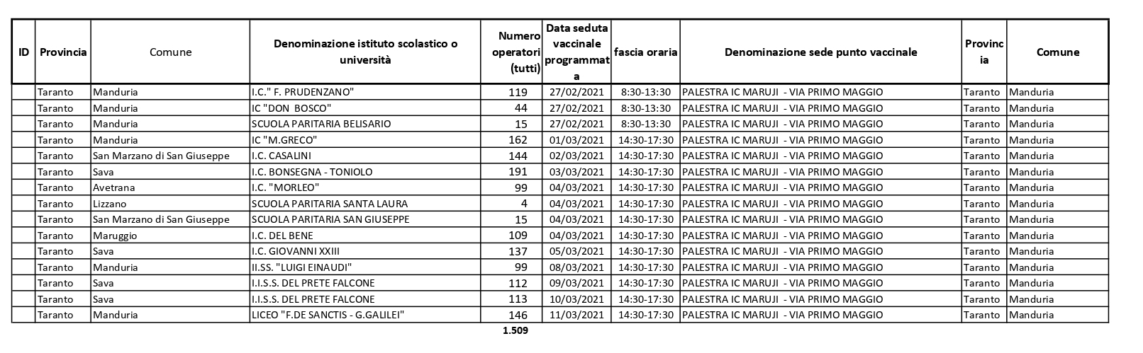 Tutte le altre sedute di vaccinazioni si svolgeranno nel pomeriggio. La Asl conta di vaccinare 1.509 unità di personale scolastico entro il prossimo 11 marzo.