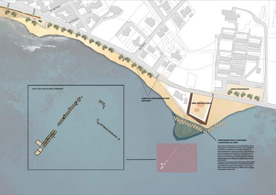 - L'intervento dell'ambito, si completerà mediante la realizzazione di un'area adibita a "verde urbano" della superficie complessiva di mq 648.90, in cui verranno piantato verde urbano del tipo macchia mediterranea su sabbia marina, con alberi autoctoni Mimosa marina (Acacia saligna), Pino d’Aleppo (Pinus halepensis), Leccio – Elce (Quercus ilex), Corbezzolo – Ciliegio di mare (Arbutus unedo), Bosso di mare (Myrsine africana), Filaria – Olivastro (Phillyrea angustifolia), da definire in fase di piantumazione. Il completamento della piazza, avverrà con idonea illuminazione pubblica, mediante installazione di punti luce a led. La riqualificazione del water front sarà implementata dal completamento della messa in sicurezza della passeggiata verso l'area archeologica, attraverso la realizzazione di marciapiedi mancanti su vari tratti della Litoranea, mediante la giustapposizione di cordoli in cls, con piano di calpestio in betonelle, tale da uniformarsi con l'esistente. In ultimo, la tutela e la riqualificazione dell'area archeologica, sarà il primo di una serie di azioni da attivare, cercando di focalizzare la priorità della Pubblica Amministrazione e della coscienza collettiva di ognuno di noi, con l'intento di poter salvaguardare quanto resta del sito archeologico nei pressi del villaggio EDEN, e contrastare l'avanzate ed inesorabile azione erosiva del mare, accelerata dalla realizzazione in mare poco distante di una struttura sommersa costituita da massi per smorzare l'energia delle mareggiate, che negli anni avevano fortemente danneggiato la base della strada litorale. La tutela dell'area, sarà eseguita mediante una massicciata fronte mare l'area archeologica, perpendicolare la direzione delle correnti marine di erosione, in stretta collaborazione con la Soprintendenza, la quale avrà l'alta vigilanza delle operazioni da eseguire, oltre ad una campagna si scavi da effettuare nella parte di terra emersa, con l'obiettivo di far emergere i resti del presunto insediamento greco-romano, come attestano numerosi studi, proprio della Soprintendenza. Qualora si dovessero riscontrare reperti e ritrovamenti interessanti, in collaborazione con la Soprintendenza sarà studiato un percorso ed il modo di tutela e salvaguardia dei richiamati reperti, realizzando di fatto, un’area archeologica visitabile per una attrattività turistico-culturale.