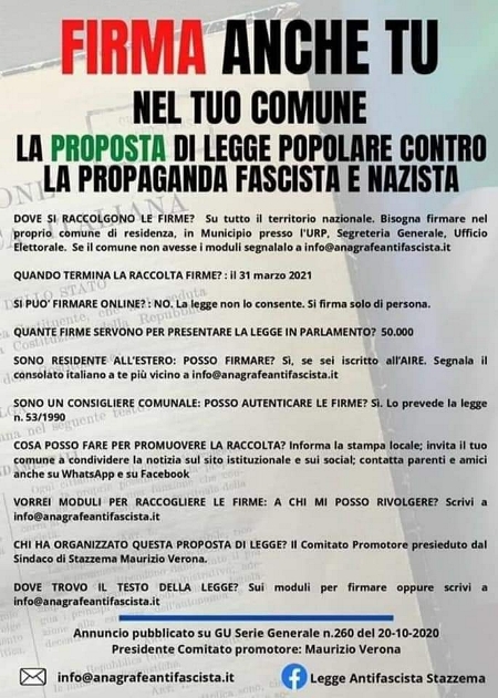 L’ANPI nazionale ci ha illustrato tutti i limiti di questa proposta legge, ma, in assenza di altro vista la gravità della situazione, abbiamo scelto si sostenere la raccolta delle firme. Ci siamo dati l’obiettivo di raccogliere 50 firme.