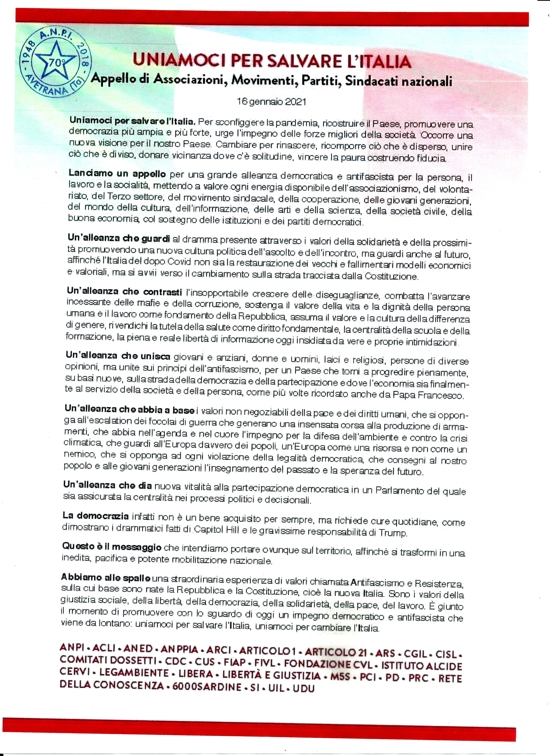 «In questi giorni ci siamo fatti carico di distribuire il testo dell’appello “Uniamoci per salvare l’Italia” a tutte le associazioni, movimenti, partiti e sindacati presenti ad Avetrana, anche se non affiliati ai firmatari nazionali» è riportato in una nota della sezione Anpi di Avetrana.