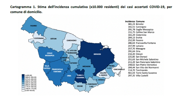 Per quanto riguarda la distribuzione per Comune i positivi sono 328 a Fasano, 209 a Brindisi, 67 a Mesagne, 55 a Francavilla Fontana, 46 a Cisternino, 45 a Ceglie Messapica, 43 a Ostuni, 36 a Torre Santa Susanna, 30 a Latiano, 30 a San Donaci, 27 a San Vito dei Normanni, 26 a San Pancrazio Salentino, 13 a Carovigno, 13 a Oria, 13 a San Michele Salentino, 11 a Cellino San Marco, 10 a Erchie, 6 a Torchiarolo, 5 a San Pietro Vernotico, 5 a Villa Castelli. I Comuni della provincia di Brindisi con i maggiori valori di incidenza cumulativa sono, nell’ordine, Torre Santa Susanna, Brindisi, Villa Castelli, Ceglie Messapica, Oria, Francavilla Fontana.