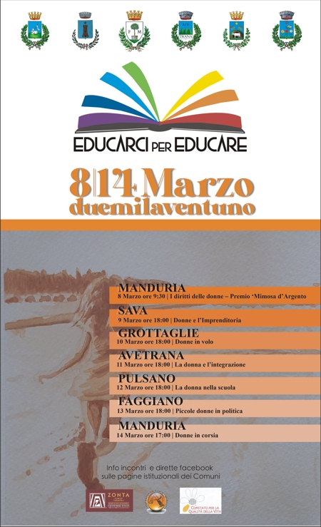 Il Comune di Manduria, in collaborazione con il liceo Artistico “Calò” – sezione distaccata di Manduria, con le associazioni “Comitato Qualità della vita di Taranto” e “Zonta Club” di Taranto e con l’adesione dei Comuni di Avetrana, Faggiano, Grottaglie, Pulsano e Sava, ha organizzato l’iniziativa denominata “Settimana della Donna”, che si svolgerà nei giorni 8-14 marzo 2021. Una settimana in cui una serie di eventi avranno come protagonista la donna nella società contemporanea.
