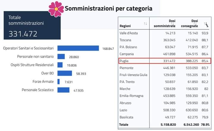 «Abbiamo somministrato oltre l’85% dei vaccini ricevuti. Per usare la scorta del 30% (che abbiamo ridotto al 15%), quella da conservare per le seconde dosi, si sta facendo un lavoro certosino di programmazione delle seconde dosi. Siamo fra le regioni italiane che sta utilizzando più velocemente tutte le consegne» annuncia l’assessore regionale alla Sanità Lopalco.