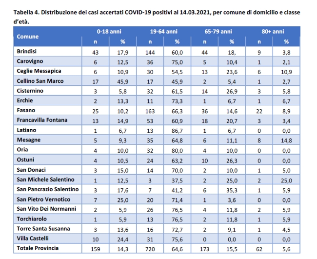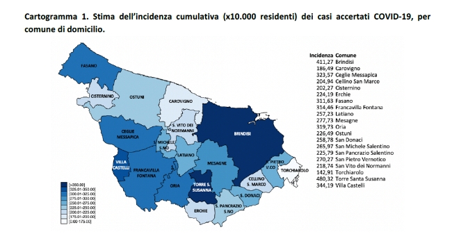 Per quanto riguarda la distribuzione per Comune i positivi sono 246 a Fasano, 240 a Brindisi, 87 a Francavilla Fontana, 55 a Ceglie Messapica, 54 a Mesagne, 52 a Cisternino, 48 a Carovigno, 41 a Villa Castelli, 40 a Oria, 38 a Ostuni, 37 a Cellino San Marco, 34 a San Vito dei Normanni, 28 a San Pietro Vernotico, 22 a Torre Santa Susanna, 20 a San Donaci, 17 a San Pancrazio Salentino, 17 a Torchiarolo, 15 a Erchie, 15 a Latiano, 8 a San Michele Salentino. I Comuni della provincia di Brindisi con i maggiori valori di incidenza cumulativa sono, nell’ordine, Torre Santa Susanna, Brindisi, Villa Castelli, Ceglie Messapica, Oria, Francavilla Fontana.