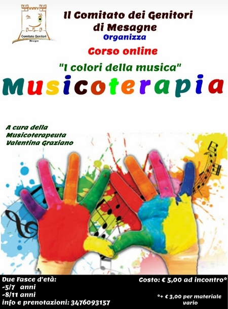 Il Comitato dei Genitori di Mesagne apre le porte ad un nuovo progetto, un corso on line di musicoterapia, con due fasce distinte d'età, per poter meglio seguire le lezioni: 5/7 anni; 8/11 anni.