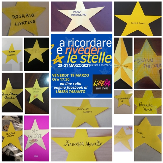 “A ricordare” vuol dire richiamare nel cuore coloro che hanno perso la vita per mano mafiosa, il 21 marzo è per loro “tornare” a essere nuovamente ricordati per rivivere nella nostra capacità di fare memoria. “Riveder le stelle”, citando l’ultimo verso dell’Inferno della “Divina Commedia” di Dante Alighieri, a settecento anni dalla sua morte, vuole essere l’augurio di uscire dall’inferno della pandemia, un desiderio forte dei nostri ragazzi e di tutti i cittadini. Si desidera quindi, una nuova luce di cambiamento. Ogni classe ha seguito un percorso di conoscenza della vita di alcune vittime e ha disegnato una grande stella con i loro nomi. Le stelle sono il simbolo delle persone che ogni giorno hanno lottato e lottano ancora per la giustizia sociale.