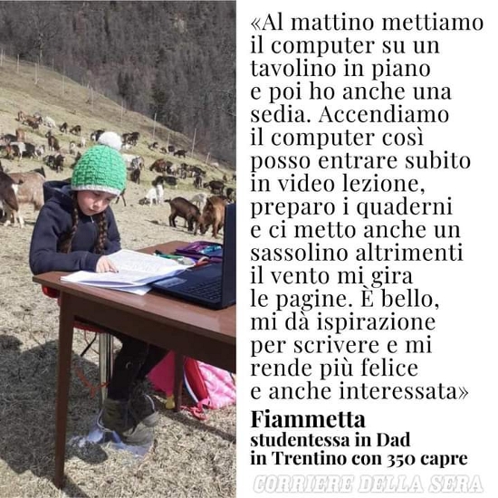 «Al mattino mettiamo il computer su un tavolino in piano e poi ho anche una sedia. Accendiamo il computer così posso entrare subito in video lezione, preparo i quaderni e ci metto anche un sassolino altrimenti il vento mi gira le pagine. È bello, mi dà ispirazione per scrivere e mi rende più felice e anche interessata», racconta Fiammetta. Il papà, originario della Sardegna (storicamente terra di pastori) ha portato questa tradizione fino in Trentino.