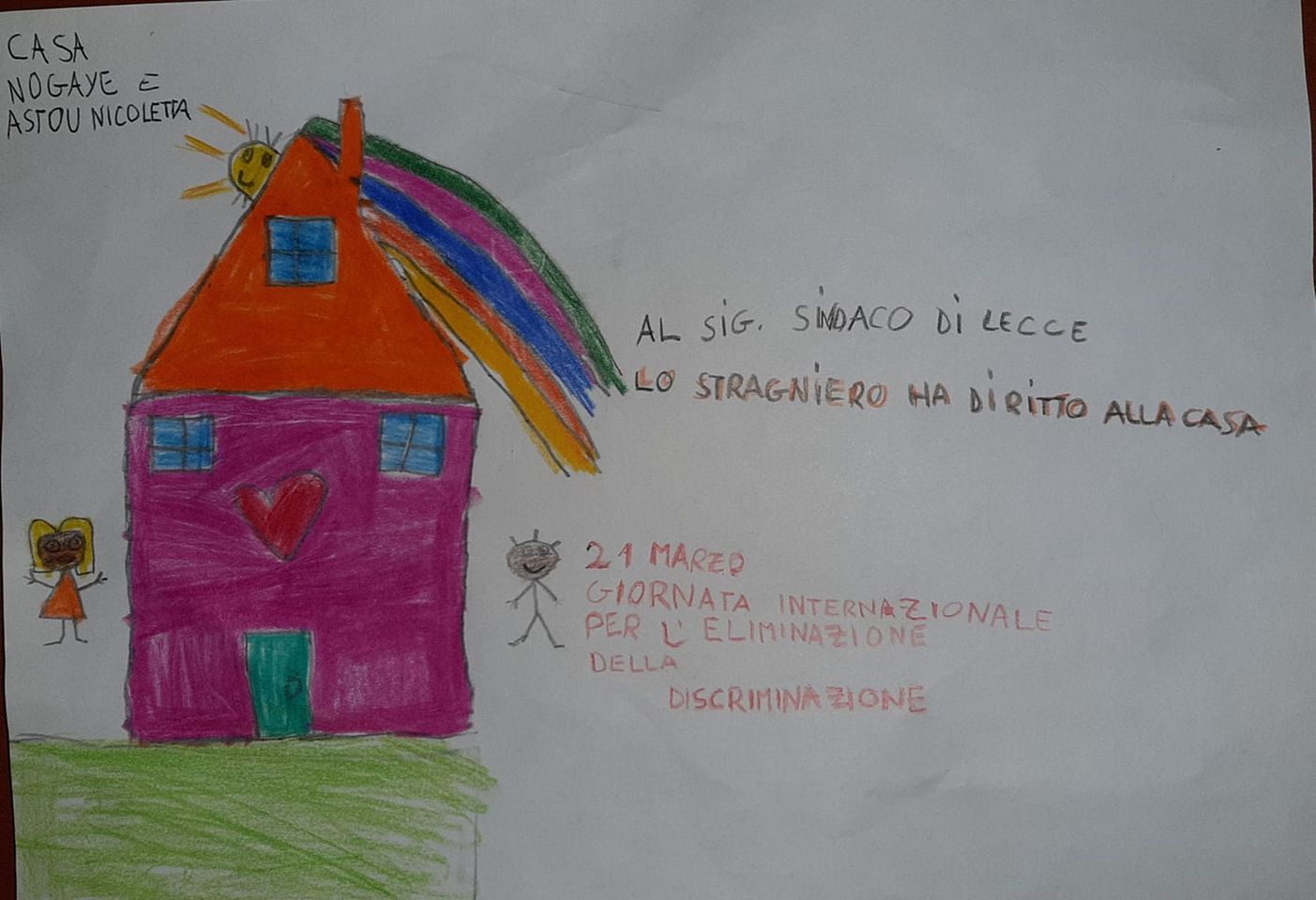 Il disegno della figlia di un senegalese da dieci anni trapiantato a Lecce e noto per il suo impegno incessante in favore dell’integrazione. La bambina non riesce a spiegarsi come mai affittare una casa ad uno straniero è così difficile: «…quindi il fatto che nessuno affitta la casa ad uno straniero è discriminazione?»
