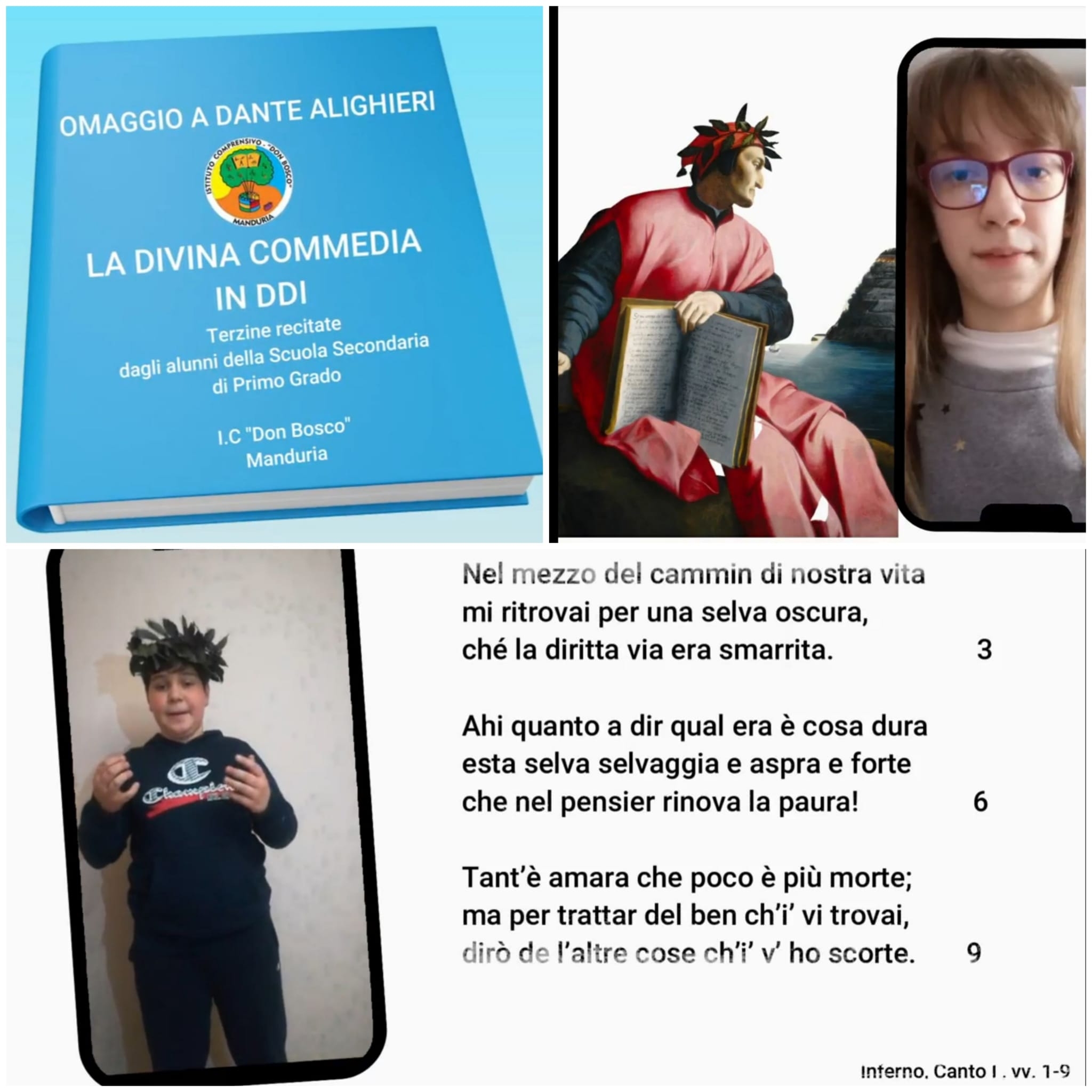 La scuola secondaria dell’istituto comprensivo “Don Bosco”, per la giornata del 25 marzo, Dantedì, in occasione dei 700 anni dalla morte di Dante Alighieri, ha accolto con piacere la bella iniziativa della libreria Testoline di Manduria, con la quale si invitavano i ragazzi dagli 11 ai 13 anni a sfogliare la Divina Commedia, a scegliere tre terzine, a recitarle ad alta voce e ad inviarle con un video.