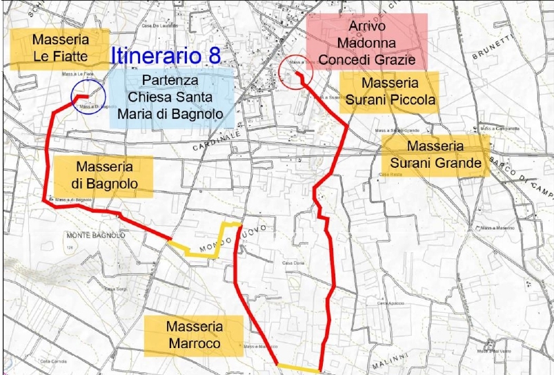 Nelle linee guida redatte dal Comune di Manduria a supporto della candidatura sono indicate alcune delle aree del territorio comunale di interesse del Piano. Fra queste i percorsi Torre Colimena-Salina e Torre Colimena-Palude del Conte; masseria Marina, macchia Rosa Marina, bosco Rosa Marina, masseria Scalella, bosco Cuturi; località Acquarone, Torre Borraco, masseria Marchese, bosco Marchese, cappella di San Pietro, masseria e bosco Maviglia, masseria Mirante; masseria Le Fiatte, Santa Maria di Bagnolo, masseria Marroco, bosco e macchia Demani, masseria Li Surii; Manduria-Uggiano Montefusco.
