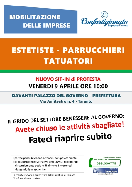 E’ forte e determinata la posizione degli operatori del benessere di Confartigianato, la preoccupazione è tanta, e con la manifestazione odierna davanti la Prefettura di Taranto in Via Anfiteatro, la categoria ritorna in piazza e si rivolgerà direttamente al Presidente del Consiglio ed al Governo tutto, per il tramite del suo rappresentante sul territorio, il Prefetto, ed alle istituzioni di ogni livello, per chiedere la riapertura immediata delle attività, lo stralcio completo della tassazione per gli anni 2020-2021, l’abbassamento dell’Iva e lo stop al pagamento degli arretrati fiscali. Inoltre servono nuove regole di accesso al credito, quelle attuali sono pensate per un mondo ‘normale’, ma adesso la situazione è totalmente cambiata. Queste azioni, oltre ai ristori, ad oggi sono le uniche che possono tenere a galla il settore. Tantissime aziende si trovano già alla canna del gas: è il momento che il Governo risponda con forza a questo grido di dolore o sarà un vero e proprio disastro economico.