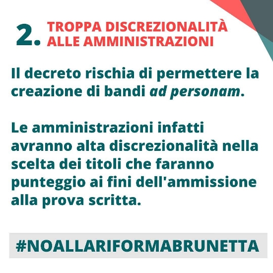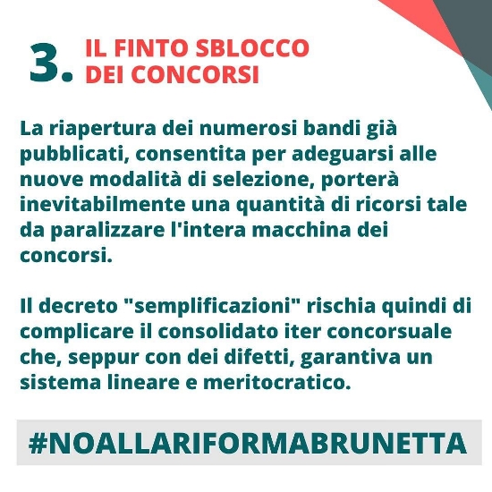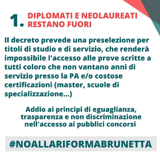 Ma pare che tutto ciò non sia bastato, perché il Ministro Renato Brunetta ha ben pensato di modificare ancora con un decreto legge adottato nel consiglio dei ministri del 31 marzo scorso - un decreto d’urgenza non discusso in Parlamento - la materia dei concorsi con una linea diversa e tutt’altro che ispirata al principio d’eguaglianza: non più tutti uguali alla linea di partenza, perché ai concorsi puoi partecipare solo sei hai i titoli come master, dottorati, certificazioni varie acquistate in qualche diplomificio o se hai esperienze professionali particolari.