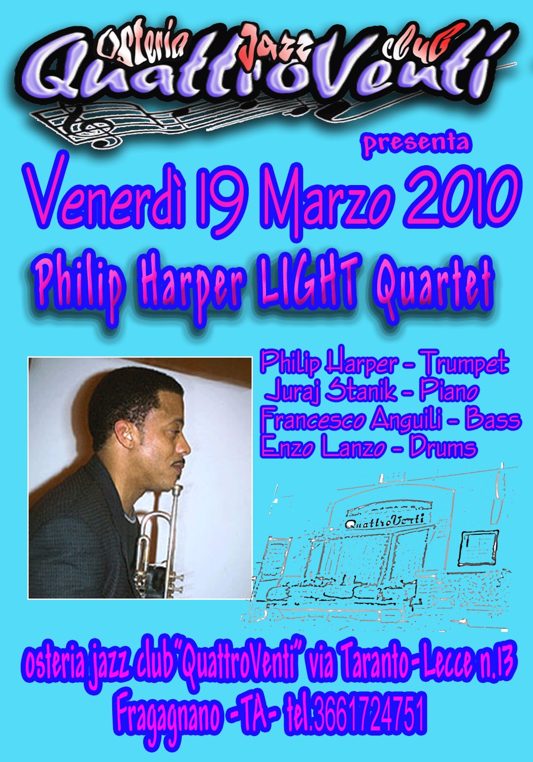 Nell’ambito della rassegna jazz “A lot of jazz with a drop of wine” 2010 l’osteria jazz club “QuattroVenti” di Fragagnano presenta, venerdì 19 marzo,