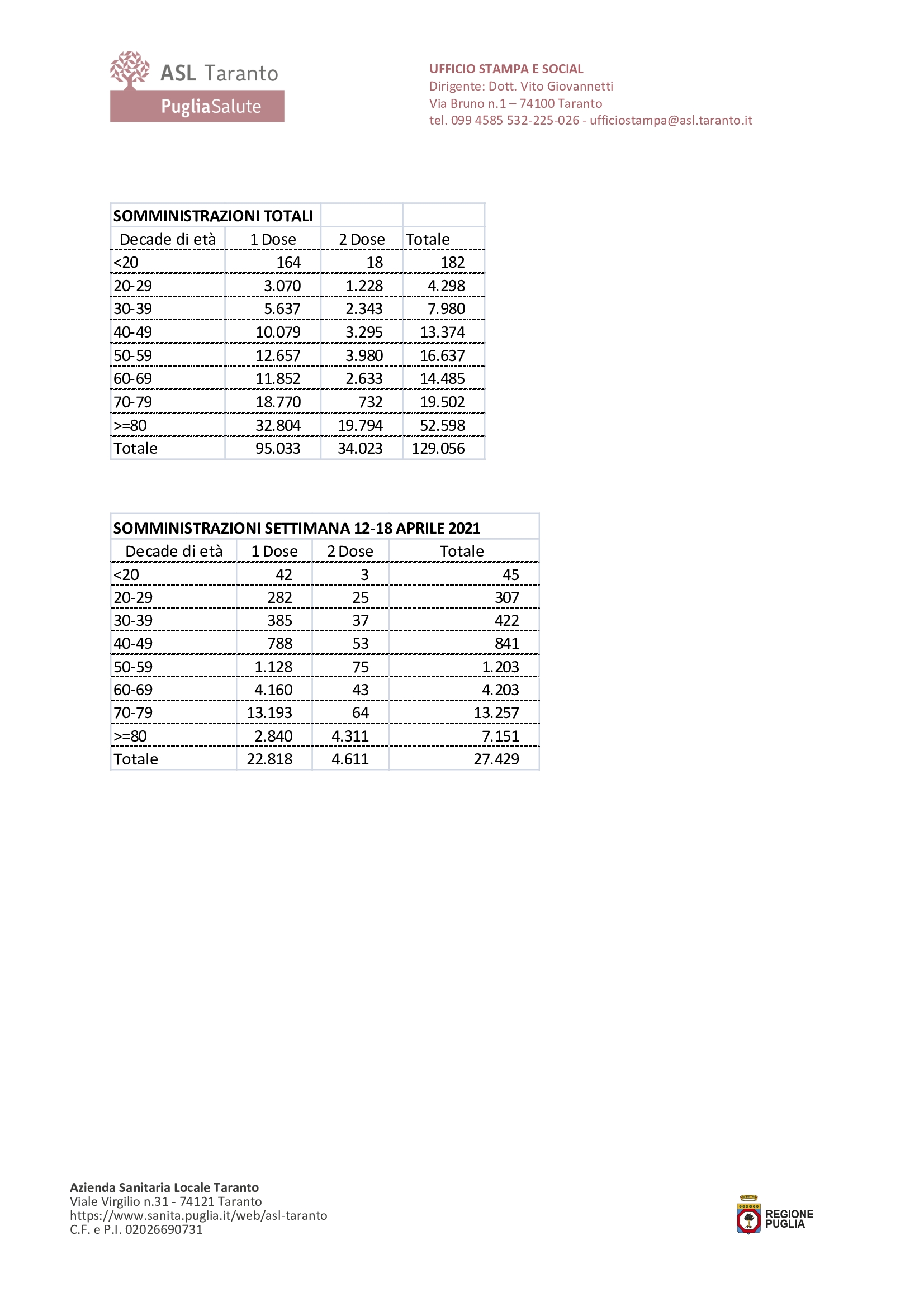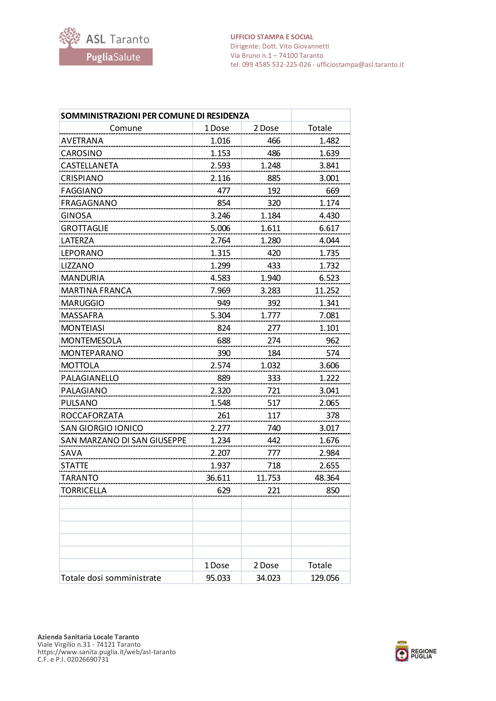 Ad oggi, in Asl Taranto, dall’inizio della campagna vaccinale sono stati somministrati oltre 141.200 vaccini, dei quali 103.700 prime dosi e 37.500 seconde dosi.