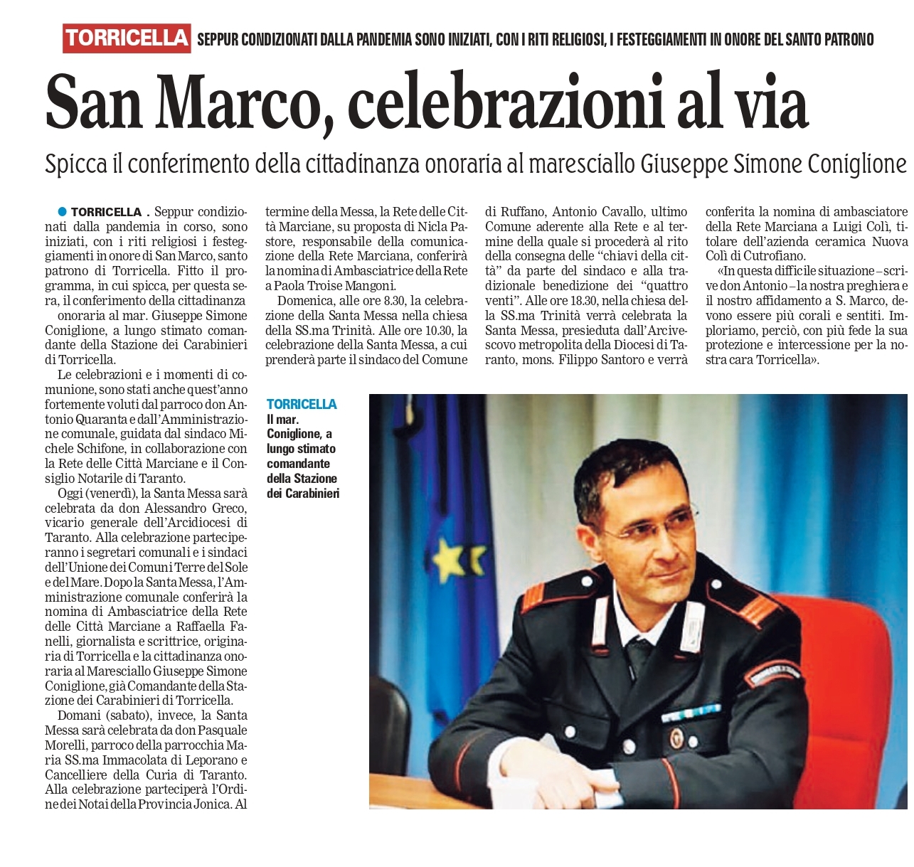 Seppur condizionati dalla pandemia in corso, prosgeuono, con i riti religiosi i festeggiamenti in onore di San Marco, santo patrono di Torricella. Fitto il programma, in cui spicca, per questa sera, il conferimento della cittadinanza