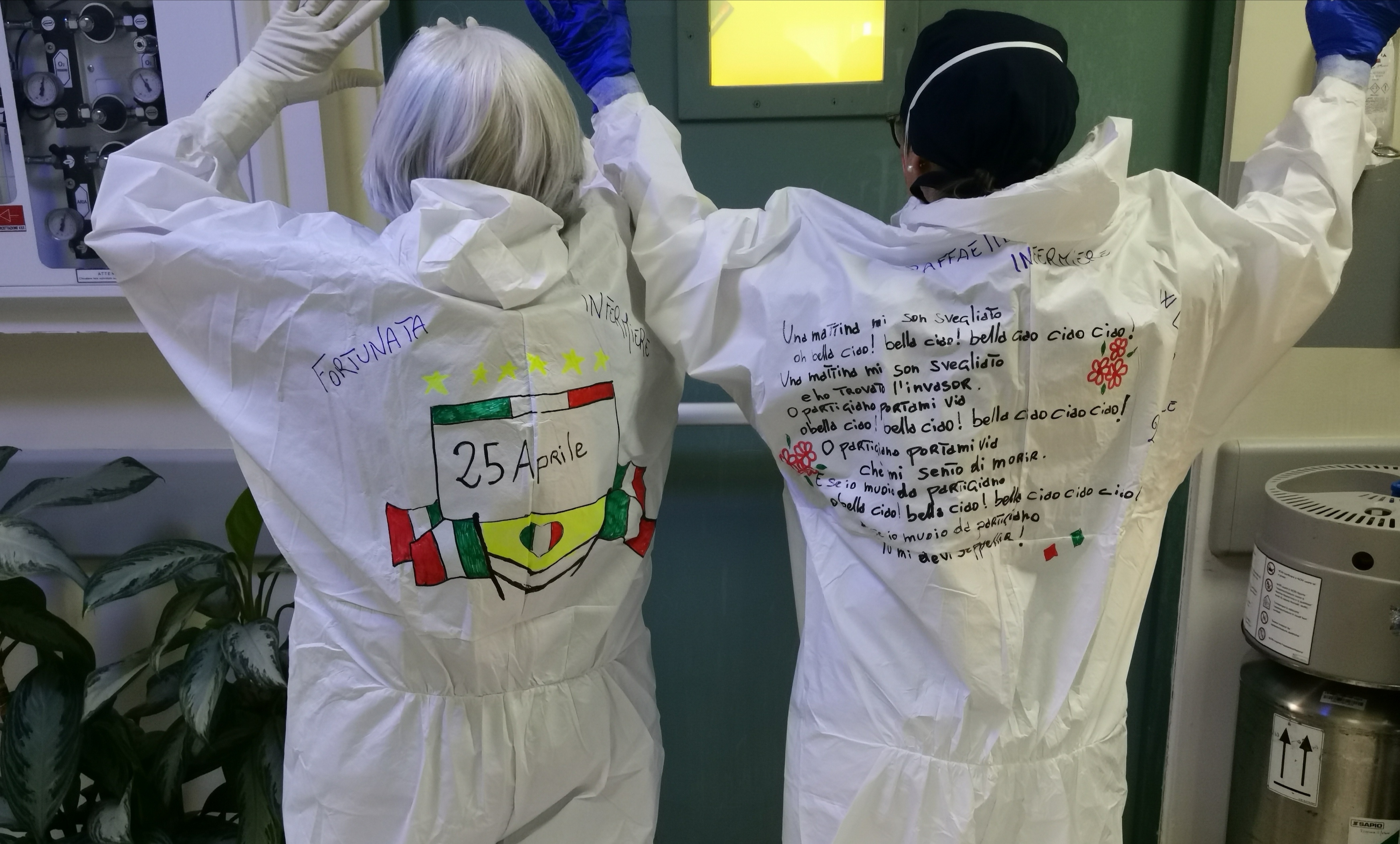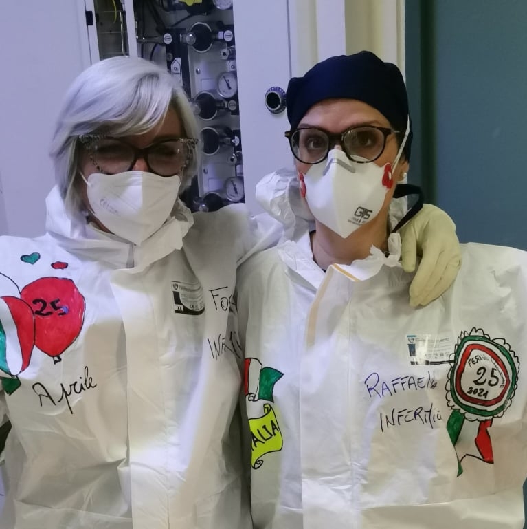 Il 25 Aprile celebrato anche nei reparti Covid del “Giannuzzi” di Manduria. Alcune infermiere hanno pensato di decorare le loro tute protettive, ricordando i tanti Caduti che hanno donato la vita per la libertà e la democrazia. Tute, come si vede dalle foto, estremamente colorate, grazie anche all’abilità delle infermiere Raffaella e Fortunata, che hanno colpito e divertito i pazienti.