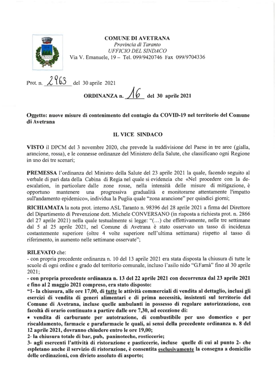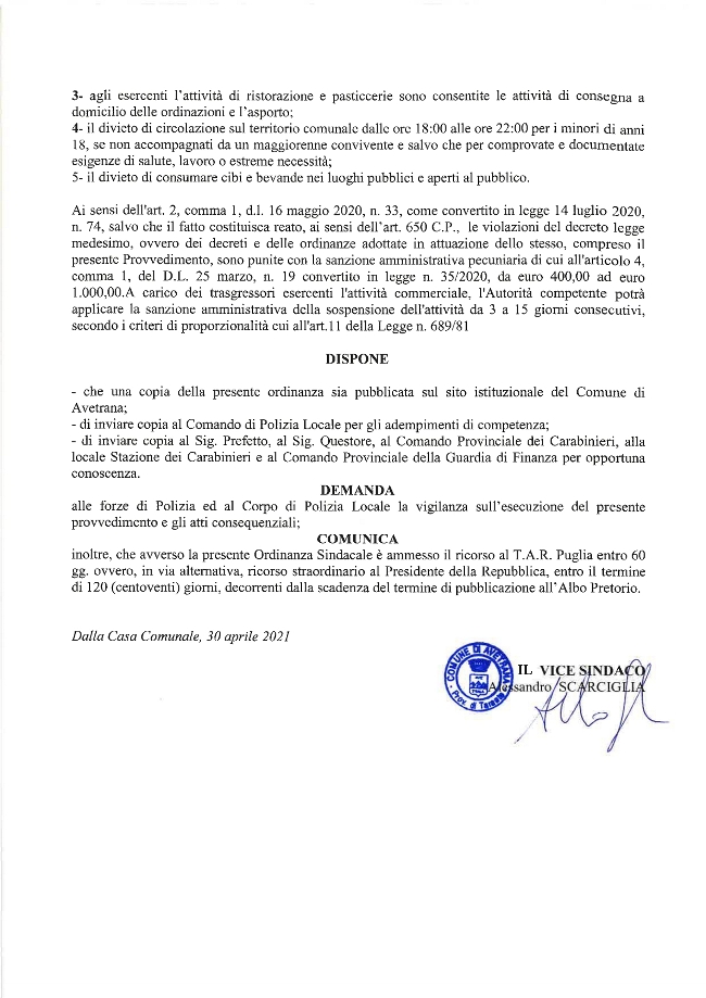 Nuova ordinanza, a firma del vice sindaco Alessandro Scarciglia, emanata quest’oggi ad Avetrana. Ecco le nuove disposizioni.