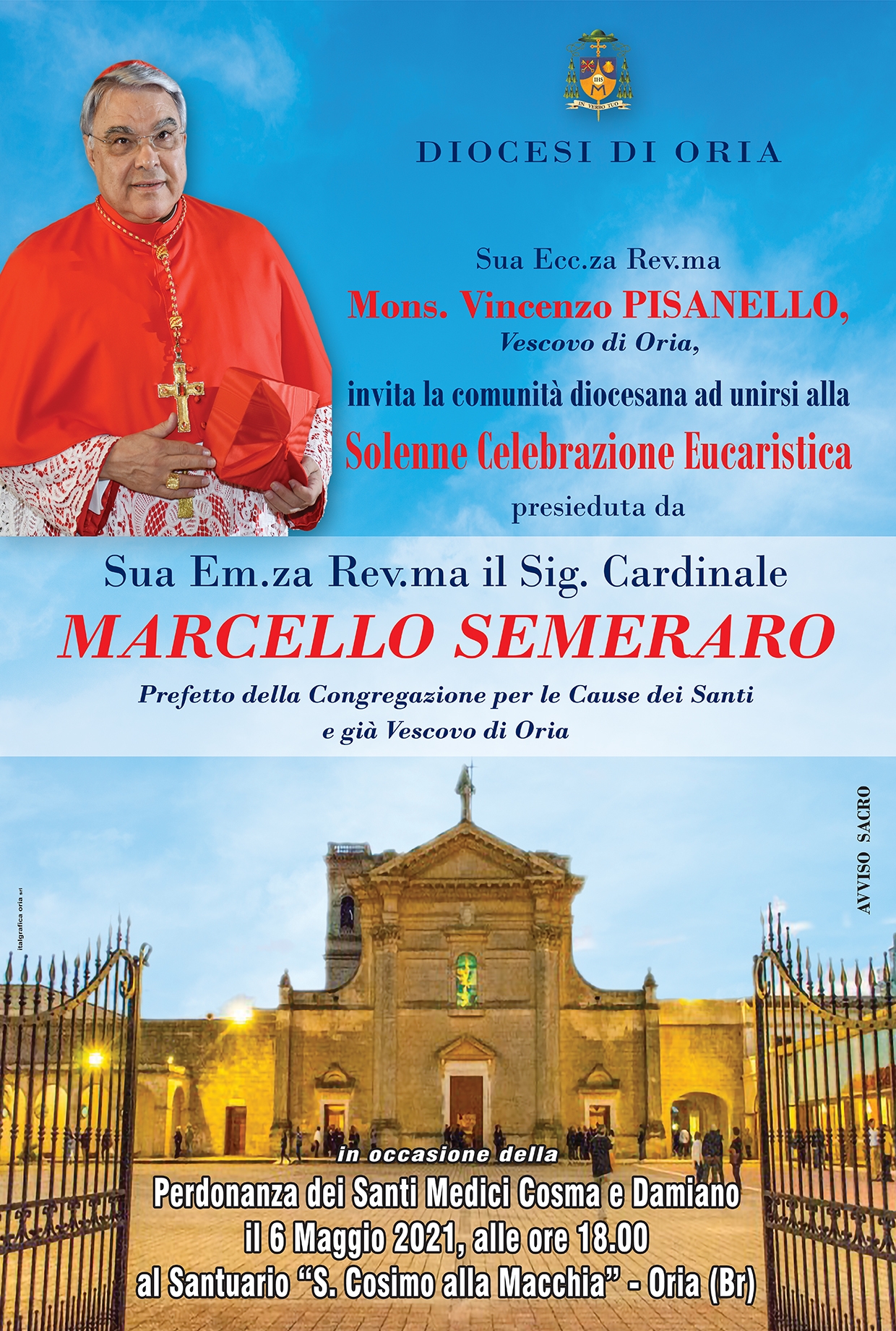 Ricorrendo la Perdonanza dei Santi Medici Cosimo e Damiano nel V giovedì dopo Pasqua, il vescovo di Oria mons. Vincenzo Pisanello invita a partecipare alla solenne santa Messa che sarà presieduta da Sua Eminenza Reverendissima il cardinale Marcello Semeraro - prefetto della Congregazione per le Cause dei Santi e già vescovo di Oria - giovedì 6 maggio, alle ore 18, nel Santuario di San Cosimo alla Macchia in Oria.