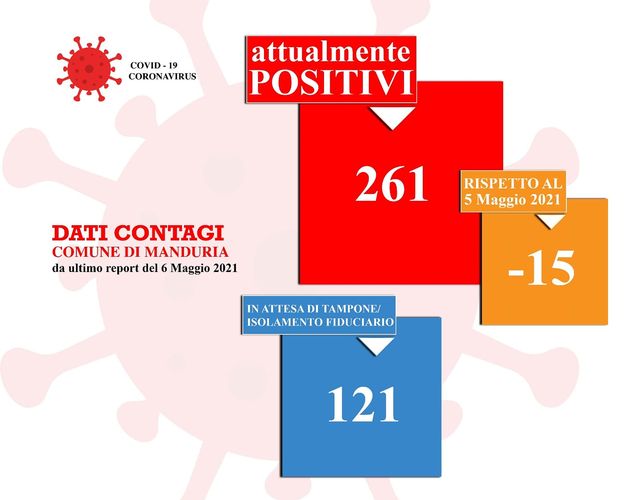 Finalmente un consistente calo nel numero degli attualmente positivi a Manduria. Nell’ultimo report se ne segnalano 261, ovvero 15 in meno del precedente bollettino. La flessione incoraggio, ma il saldo fra nuovi positivi e negativizzati (261) resta comunque alto. Nella speranza che il passaggio in zona gialla della nostra regione non provochi una nuova crescita di casi.