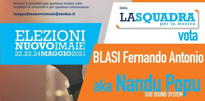 Mi sono candidato con “La Squadra per la Musica” perché credo in questo progetto. Il Nuovo IMAIE deve rappresentare un’ottima esperienza per gli artisti indipendenti e ci siamo messi in gioco perché vogliamo migliorarla, facendola arrivare nelle provincie, nei piccoli luoghi dove appunto gli artisti indipendenti descrivono la musica sotto diverse sfumature. Un po’ com’è stata la sperimentazione dei Sud Sound System che non è passata inosservata alle major che, spesso, anche senza pagare dazio, prendono spunto per poi riproporla nel mainstream. La cosa importante per questa lista è che del Nuovo IMAIE vuole fare trampolino di lancio di tutte le istanze degli artisti. Migliorare la comunicazione tra la collecting e i suoi iscritti per avere un controllo più oculato delle sue opere. Puglia Sound e tutte le realtà del Salento sono molto contente del lavoro svolto dalla lista “La Squadra per la Musica”. Penso che questo sforzo nei confronti dell’arte degli artisti sia importante per permettere alle etichette e agli artisti indipendenti di avere un peso maggiore nei confronti del mainstream che diffonde contenuti molto frivoli e, invece, ha bisogno di messaggi rivoluzionari, volti a tutelare la musica indipendente che bussa all’anima e vede quello che c’è nella strada e non nella vetrina del corso di una grande città. Proprio per questo “La Squadra per la Musica” ed il Nuovo IMAIE devono prendere una direzione segnando il passo, facendo capire che l’arte per gli artisti deve essere fonte di redditi e di diritti, anche e soprattutto per tutti i lavoratori dello spettacolo. Questo è il vero spirito della lista “La Squadra per la Musica”.