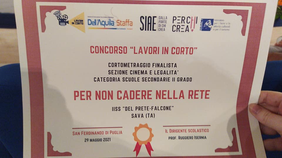 Il corto “Per non cadere nella Rete”, realizzato dal prof. Giovanni Buccoliero con gli studenti dell’istituto “Del Prete-Falcone”, si è classificato al secondo posto (su un totale di 51 scuole partecipanti), al concorso nazionale per cortometraggi “Lavori in corso”, promosso a San Ferdinando di Puglia.