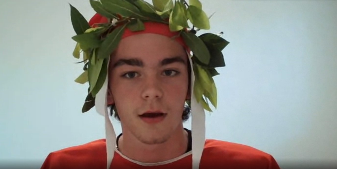 A seguire, gli alunni delle diverse classi hanno dato vita ad una serie di interventi dedicati, il cosiddetto “oMaggio a Dante”, caratterizzato da ricchezza e varietà performativa, in cui non è mancata la l’apparizione istrionica del poeta della Commedia, interpretato abilmente da uno studente attore, ironicamente intervistato da una giovane giornalista in erba.