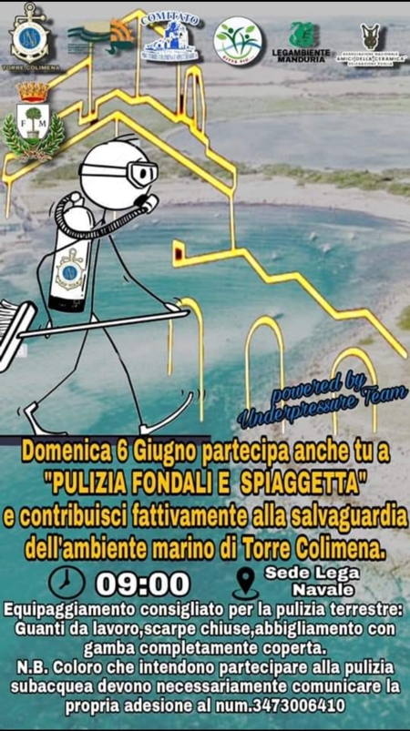 Insieme per contribuire a pulire fattivamente alla salvaguardia dell’ambiente marino di Torre Colimena. L’invito parte dalla sezione di Torre Colimena della Lega Navale e dal gruppo subacqueo Underpressure Team, che per domenica prossima, alle 9, promuovono l’iniziativa “Pulizia fondali e spiagetta”.