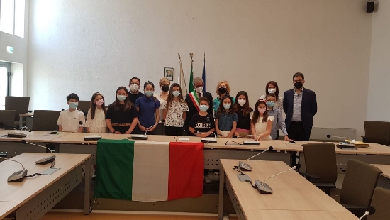 Una rappresentanza degli alunni delle classi V dell’I.C. “Don Bosco” nell’aula consiliare per discutere di Costituzione alla presenza del sindaco Gregorio Pecoraro, dell’assessore alla Cultura Andrea Mariggiò e dell’assessore alle Politiche Sociali Fabiana Rossetti, della dirigente dell’istituto Luisa Damato e del graditissimo ospite Domenico Facchini.
