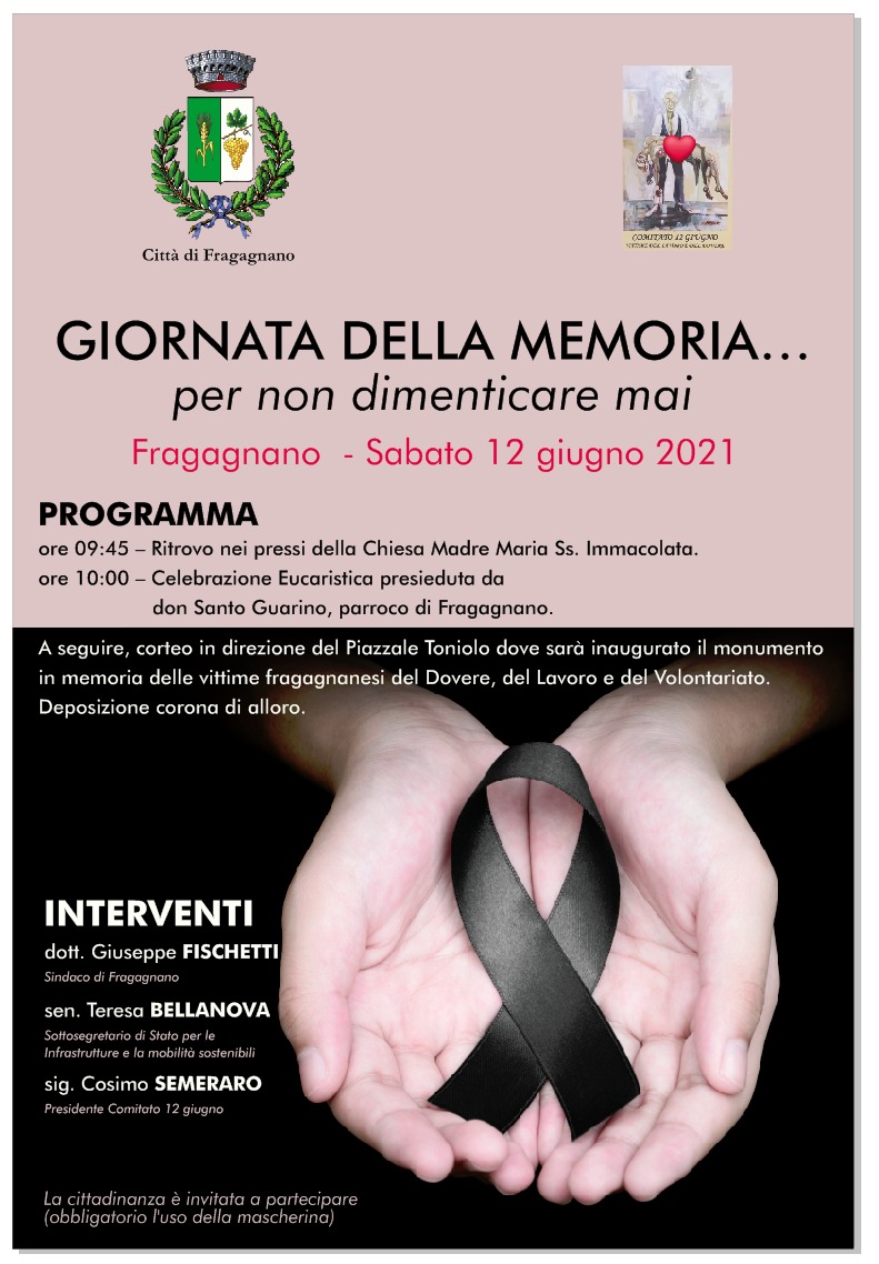 Interverranno Giuseppe Fischetti, sindaco di Fragagnano; la sen. Teresa Bellanova, Sottosegretario di Stato per le Infrastrutture e la Mobilità Sostenibile e Cosimo Semeraro, presidente del Comitato 12 giugno.