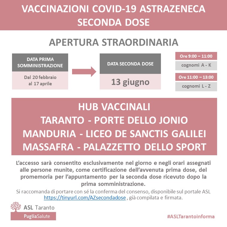 Per venire incontro alle esigenze dei cittadini, riducendo gli spostamenti, sono stati individuati tre hub vaccinali attivi dalle ore 9 alle ore 13: a Taranto il drive through presso il centro commerciale Porte dello Jonio, a Manduria presso il Liceo De Sanctis Galilei in Via Sorani 33, a Massafra presso il Palazzetto dello sport "Giovanni Paolo II" in Via Crispiano.