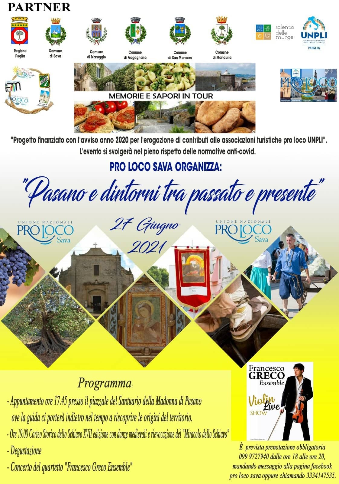 Si chiama “Memorie e sapori in tour” la proposta progettuale relativa all’Avviso anno 2020 per l’erogazione di contributi alle associazioni turistiche Pro Loco, approvata e ammessa al finanziamento dalla Regione Puglia che nasce dalla sinergia e dalla collaborazione tra le Pro Loco dei territori di Maruggio, Manduria, Sava, Fragagnano e San Marzano di S. Giuseppe. Essa è espressione del valore di una rete associativa che intende ottimizzare gli strumenti di coordinamento per sostenere il territorio in ambito turistico, culturale e sociale, in un’ottica di qualità e sostenibilità, affinché sia gli ospiti che i residenti si sentano protagonisti di un percorso di conoscenza territoriale.