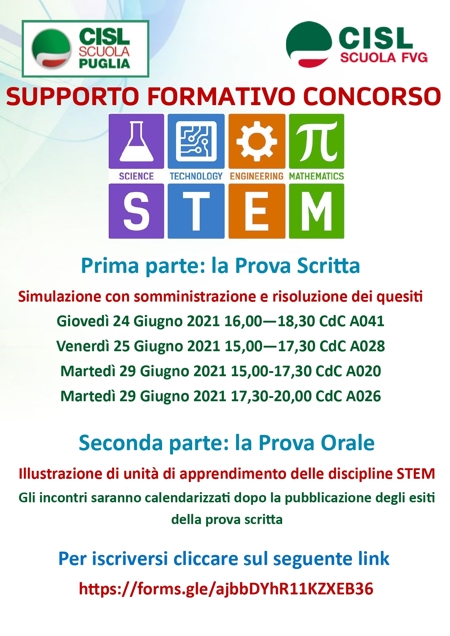 Il prossimo 24 giugno prenderà il via il “Supporto formativo” al Concorso STEM, strutturato in due parti, una per la prova scritta e l'altra per quella orale, organizzato da Cisl Scuola Puglia e Cisl Scuola FVG.