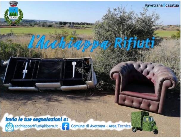 «Gli operatori si occuperanno di mantenere, strade, periferie quanto più puliti, ordinati e decorosi possibile» spiega l’assessore all’Ambiente Francesco Saracino. «Collaborare con l’“Acchiaparifiuti” è semplicissimo. Saranno indispensabili le segnalazioni effettuate dai cittadini. È possibile, e anche molto semplice infatti, inoltrare segnalazioni utilizzando vari canali, tra questi la pagina facebook “Comune di Avetrana – Area Tecnica” raggiungibile tramite smartphone, oppure tramite l’apposito indirizzo mail acchiapparifiuti@libero.it.