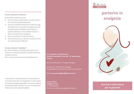 “Il servizio di partoanalgesia rientra tra i LEA livelli essenziali di assistenza e, come definito dalla delibera regionale n. 796 del 2017, in una struttura come il SS. Annunziata, che ha un numero di parti all’anno superiore ai mille e tutti i requisiti strutturali, tecnologici, organizzativi e di risorse umane previsti, deve essere possibile per le donne che ne facciano richiesta accedere a questo servizio. – ha affermato ilDirettore Generale della ASL Taranto, Stefano Rossi – L’obiettivo di questo nuovo sistema, con la possibilità di seguire il videocorso online comodamente da casa propria, permette di raggiungere e informare molte gestanti e promuovere quindi un servizio che è raccomandato dall’Organizzazione Mondiale della Sanità per le donne in buona salute che intendano avere un sollievo dal dolore durante il travaglio.”