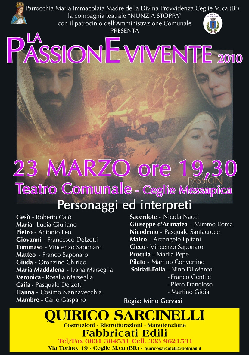 Comunale di Ceglie Messapica, la parrocchia Maria Immacolata della Divina Provvidenza, col patrocinio dell’Amministrazione Comunale, presenterà la “Passione Vivente 2010”.
