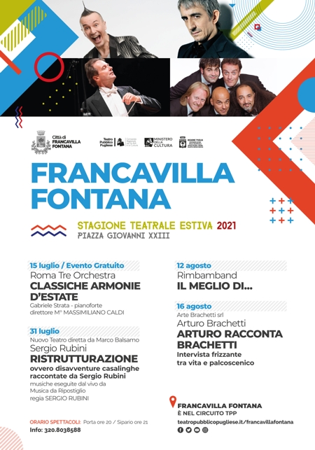 Sergio Rubini, Arturo Brachetti, Rimbamband e Roma Tre Orchestra saranno i protagonisti in piazza Giovanni XXIII dei primi eventi dell’estate teatrale francavillese a cura dell’Amministrazione comunale in collaborazione con il Teatro Pubblico Pugliese con il patrocinio del Ministero della Cultura e della Regione Puglia.