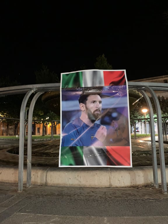 Due scatti per raccontare il tifo … alternativo e originale dei tifosi manduriani, che ieri hanno gioito per la vittoria dell’Italia agli Europei. Siamo passati, infatti, dallo striscione “Cavolfiori, pomodori e Raspadori” (esposto durante la partità d’esordio degli azzurri e ripreso da tv e quotidiani) al manifesto con Messi in maglia azzurra, affisso, notte tempo, prima della finalissima di ieri sera.