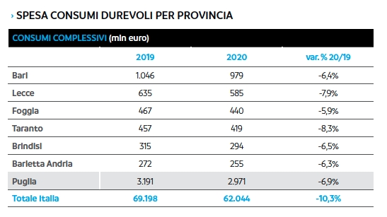 In Puglia la spesa per i beni durevoli scende sotto i 3 miliardi (per la precisione 2,971) con una perdita di 220 milioni, come rileva l’Osservatorio Findomestic 2020, realizzato in collaborazione con Prometeia. Il passivo del 6,9% è comunque tra i più contenuti nel quadro nazionale, dove il calo medio si attesta al 10,3%. Il ‘rosso’ più pesante nel territorio pugliese è quello del comparto auto: -17,2% nel segmento del nuovo (-111 milioni) e -9,4% in quello dell’usato (-97 milioni).