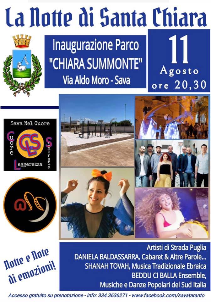L’inaugurazione del parco avrà luogo l’11 agosto, giorno dedicato a Santa Chiara e, nell’occasione, prenderà il via un nuovo ed importante evento savese denominato “La Notte di Santa Chiara”, ideato e curato dall’associazione “Sava nel Cuore”.