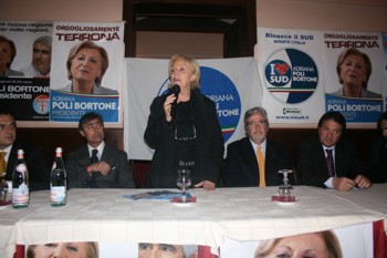 «Abbiamo già sperimentato le capacità di Pd e del PdL: credo che anche a Manduria non abbiamo un buon ricordo di quelle Amministrazioni» ha affermato ieri pomeriggio la senatrice Adriana Poli Bortone. «Ebbene, proprio quando è stato fondato il PdL e quando la Lega ha iniziato a parlare insistentemente di federalismo e di dividere l’Italia, io ho deciso di dar vita ad Io Sud, che rappresenta una rivoluzione culturale, ma anche sociale ed economica. Andiamo avanti da soli, con il coraggio delle nostre idee e con il nostro programma. Qualcuno ci obietta: “Che fine farete dopo le elezioni”. A costoro rispondiamo che siamo appena all’inizio e che il nostro futuro sarà un forte partito del Sud. A livello regionale abbiamo già l’alleanza con il Movimento per le Autonomie di Lombardo. Ma non sarà l’unico partito che sposerà la nostra idea. Già parti del PdL si stanno staccando. Un esempio è Miccichè, che in Sicilia ha fondato il “PdL Sicilia”. Tutti insieme impediremo che la Lega continui a calpestare il Sud».