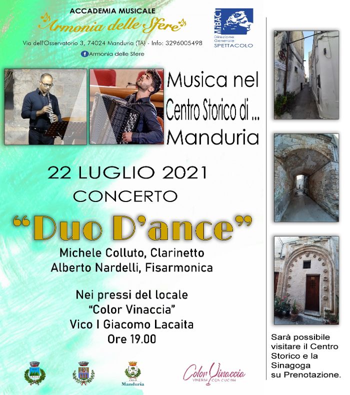 A dare il “la” il Duo D’ance Clarinetto e Fisarmonica di Michele Colluto e Alberto Nardelli in concerto il 22 luglio alle ore 19 in vico I Senatore Giacomo Lacaita, nei pressi della Vineria Color Vinaccia a Manduria. Il Duo D’ance replicherà la serata il 6 agosto presso il Bosco Cuturi, in armonia con la natura, in occasione della conclusione di uno stage organizzato dall’associazione Aikido di Manduria.