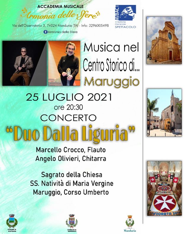 Il 25 luglio alle ore 20.30 Armonia delle Sfere ospiterà invece un duo proveniente dalla Liguria, al flauto Marcello Crocco e alla chitarra Angelo Olivieri: cornice di questo concerto sarà il sagrato della chiesa Madre di Maruggio nell’ambito della programmazione estiva del Comune di Maruggio.