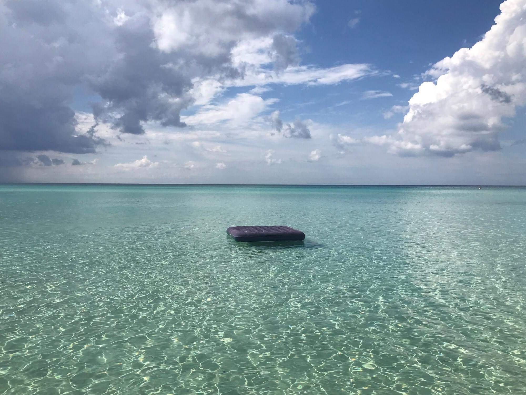 Il bellissimo mare color blu cobalto incastrato da un cielo in cui il blu sembra fare a gomitate con nuvole, di varie sfumature, di passaggio. Al centro, sulle acque chete, un materassino.