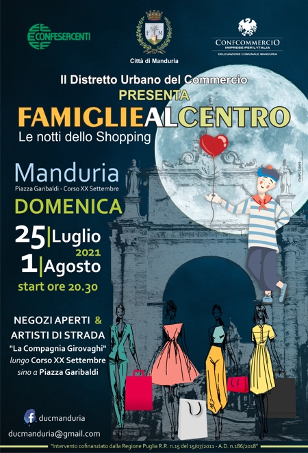 Nelle serate di domenica 25 luglio e domenica 1° agosto il cuore commerciale di Manduria pulserà di street art e shopping con “Famiglie al Centro – Le notti dello Shopping”. L’associazione del Distretto Urbano del Commercio di Manduria è lieta di annunciare due eventi serali in concomitanza dell’avvio dei saldi estivi che quest’anno partiranno il 24 Luglio.