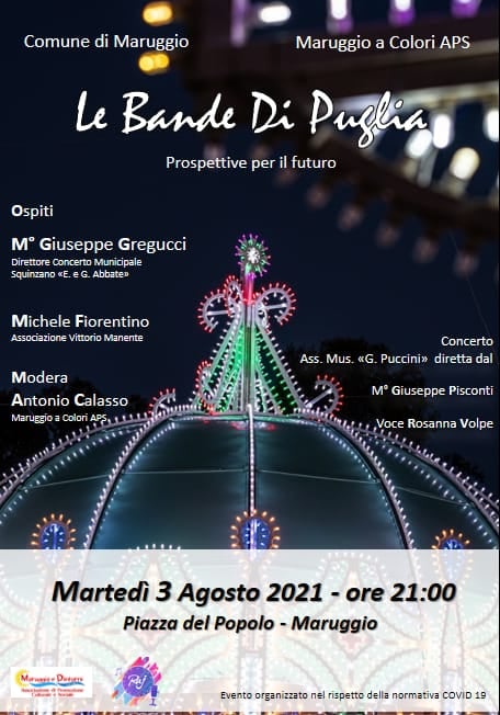 “È proprio da qui che vogliamo ripartire, auspicando che le bande della terra di Puglia, possano portare quell’aria di festa che oggi manca durante i festeggiamenti civili e religiosi delle nostre feste patronali” afferma Antonio Calasso, presidente della “Maruggio a Colori”, organizzatore dell’evento che vuole diventare un punto di riferimento per tutti i musicisti delle bande da giro dell’intera terra jonica e non solo.