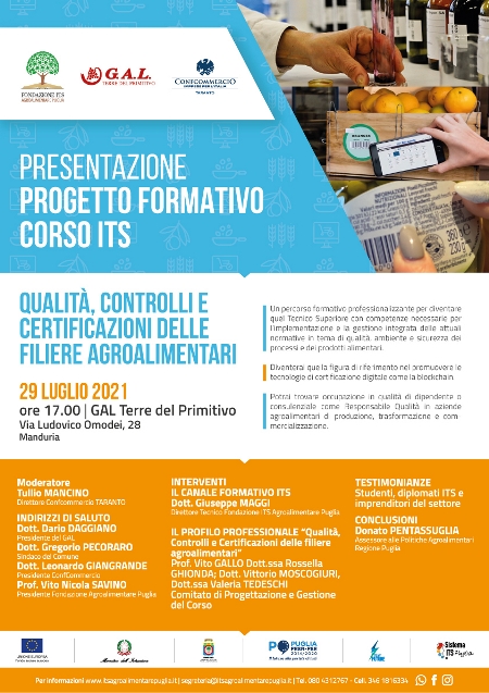A entrare nel merito dei contenuti del Corso denominato “Qualità, Controlli e Certificazioni delle filiere agroalimentari”, saranno Vito GALLO, Rossella GHIONDA, Vittorio MOSCOGIURI e Valeria TEDESCHI, tutti membri del Comitato di Progettazione e Gestione del Corso. Inoltre, nel programma dell’iniziativa sono previste le testimonianze di studenti e diplomati ITS, oltre che di imprenditori del settore agroalimentare.