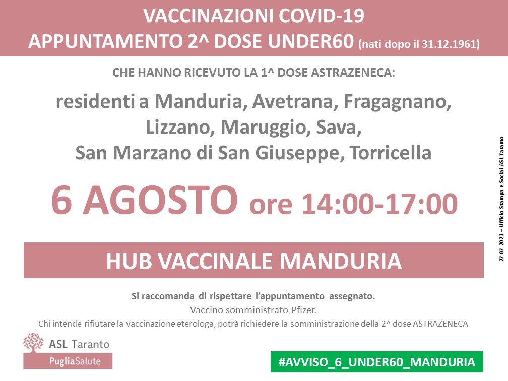 I residenti a Taranto e le persone non residenti nella provincia ionica, ma che hanno ricevuto la prima dose AZ nella ASL di Taranto, potranno recarsi presso l'Hub vaccinale della Scuola Volontari Aeronautica Militare SVAM in Via Rondinelle 26 a Taranto: martedì 3 agosto dalle ore 16.00 alle ore 18.00 sarà il turno tutti i cittadini con iniziale del cognome compresa tra la lettera A e C; mercoledì 4 agosto dalle ore 16.00 alle ore 18.00 sono convocati tutti i cittadini con iniziale del cognome compresa tra la lettera D e K; giovedì 5 agosto dalle ore 16.00 alle ore 18.00 sono attesi tutti i cittadini con iniziale del cognome compresa tra la lettera L e M; venerdì 6 agosto dalle ore 14.00 alle ore 17.30 sono convocati tutti i cittadini con iniziale del cognome compresa tra la lettera N e Z.