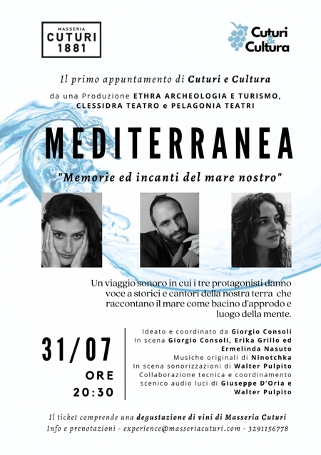 In un reading a tre voci attoriali con musiche originali (eseguite anche dal vivo per l’occasione), saranno in scena le attrici Erika Grillo ed Ermelinda Nasuto e l’attore Giorgio Consoli, anche ideatore e coordinatore registico dello spettacolo. “Mediterranea” è uno degli spettacoli proposti per il progetto “Polysemi”. Presentato a Taranto tra febbraio e settembre 2020, il progetto vede la committenza produttiva e la consulenza ai testi e alle ricerche dei professionisti archeologi di Ethra Francesca Razzato e Riccardo Chiaradia.