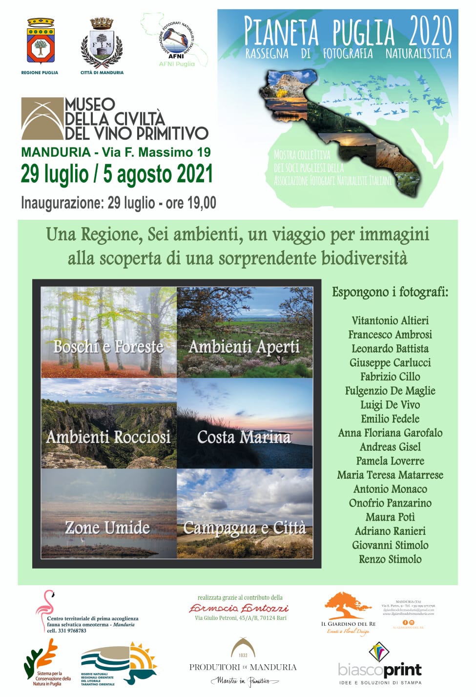 Museo della civiltà del vino primitivo Manduria, Il giardino del re Manduria, Riserve naturali regionali orientate del litorale tarantino orientale, Centro territoriale prima accoglienza della fauna selvatica di Manduria, Biasco Print Manduria, Farmacia Fantozzi Bari.