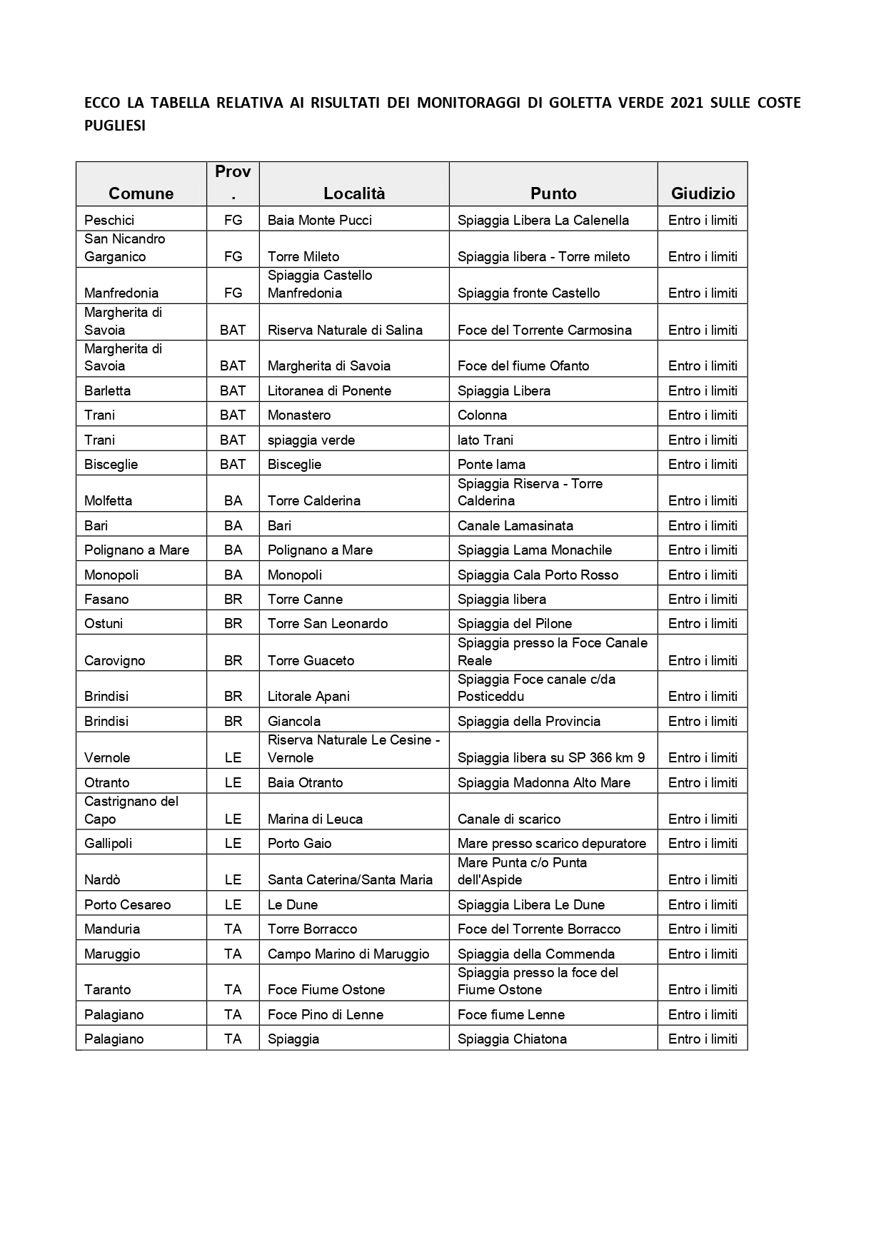 4 i punti monitorati in provincia di Bari: la spiaggia Riserva Torre Calderina a Molfetta, il canale Lamasinata a Bari, la spiaggia Lama Monachile a Polignano a Mare e la spiaggia Cala Porto Rosso.